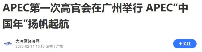 1.《APEC第一次高官会在广州举行 APEC“中国年”扬帆起航》2026-02-11 10:10|来源:大湾区经济网