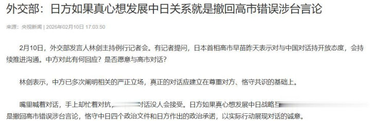2.《外交部:日方如果真心想发展中日关系就是撤回高市错误涉台言论》2026年02月10日 17:03:50|来源:央视新闻